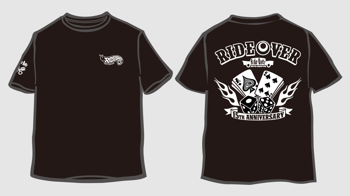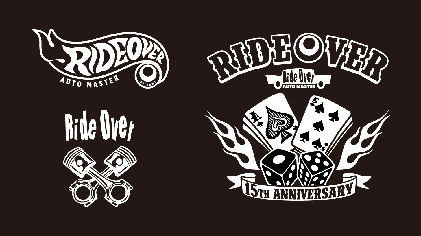 北谷町砂辺の中古車販売店RIDE OVER様より、周年記念のオリジナルプリントTシャツ製作のご依頼を承りました。ちょいワルでイケてる車(笑)を多数ラインナップされているRIDE OVERさんのイメージを手描きのイラストでラフ&ポップな感じに表現しました。