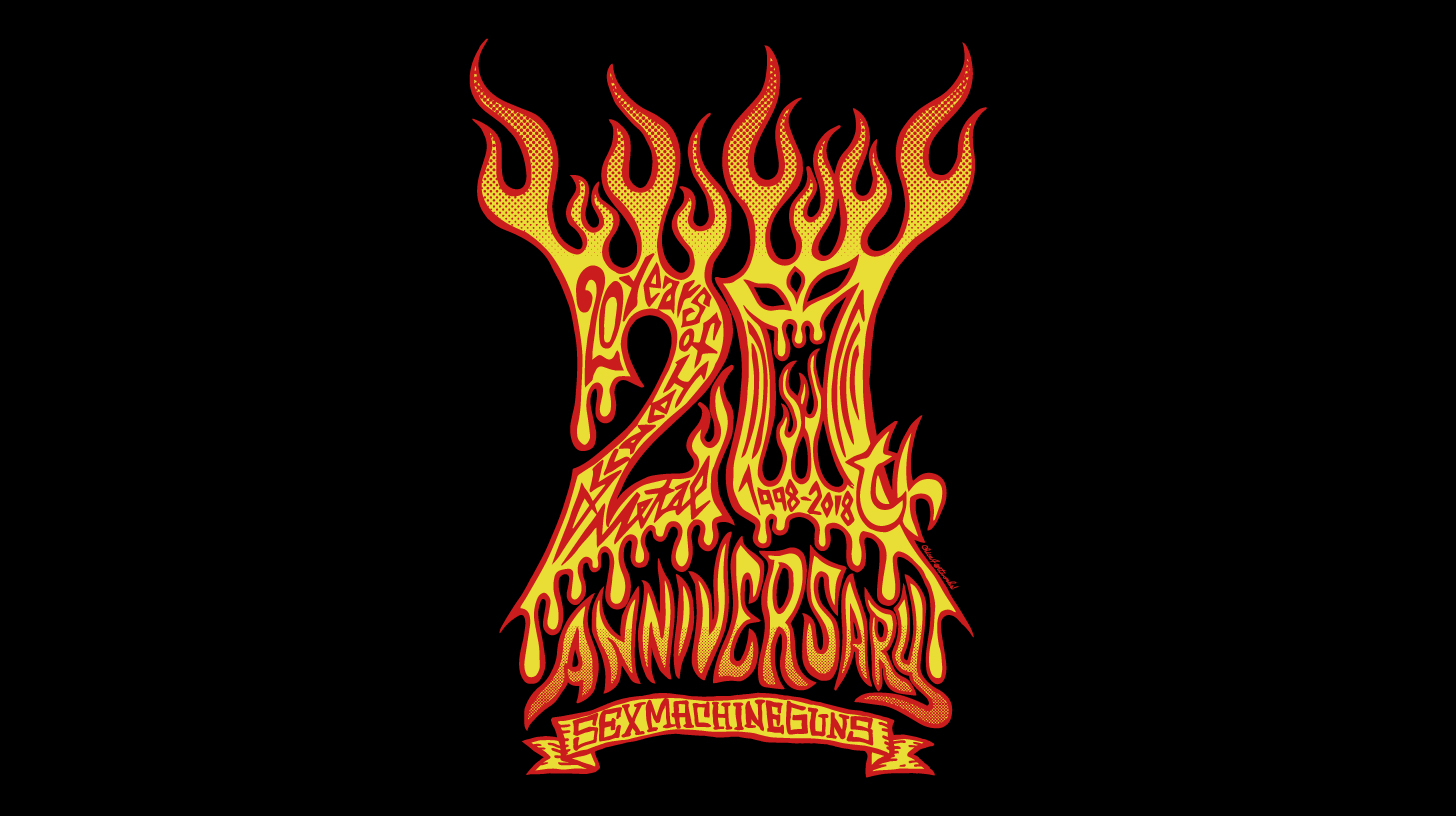 ヘヴィーメタルバンドSEX MACHINEGUNS様より、結成20周年メモリアルTシャツデザインのご依頼をいただきました。ヘヴィーメタルバンドということで、デザインには燃え盛る炎と悪魔のようなイラストを描いてレイアウトしました。我ながらバンドのイメージに合ったカッコよいデザインになったと思います。