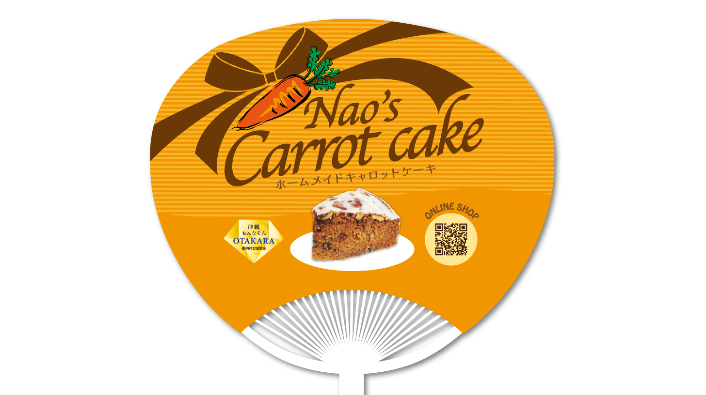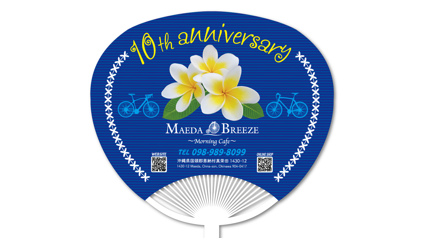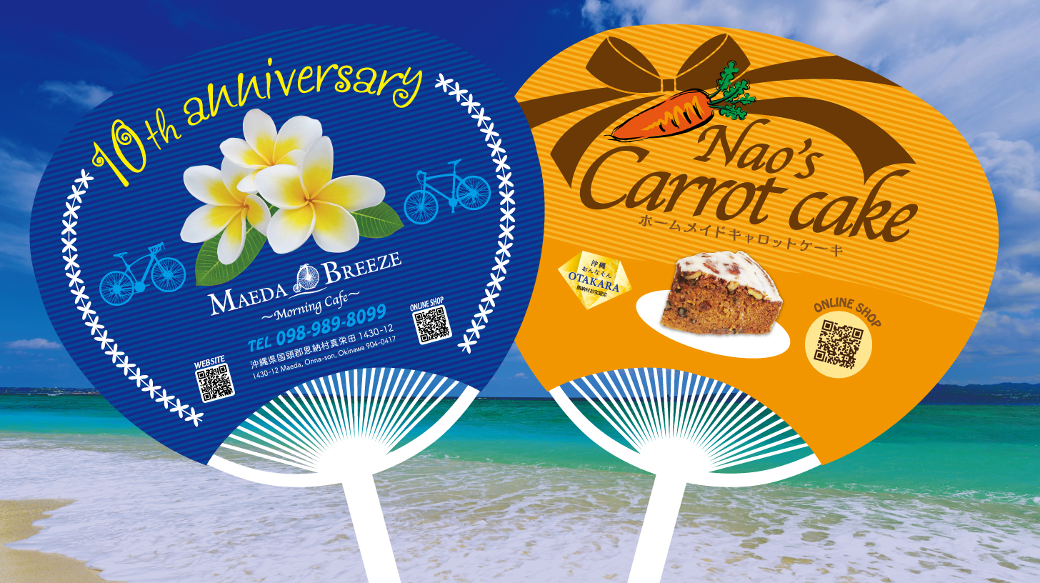 恩納村真栄田:MAEDA BREEZE様より、オリジナルうちわの製作を承りました。A面はブルーの背景に南国をイメージさせるプルメリアと自転車のシルエットをレイアウト。もう片面は名物のキャロットケーキのイメージを反映しました。こちらは10周年記念のノベルティーグッズとのことで、周年期間中ご来店のお客様に配布されたとのことです。