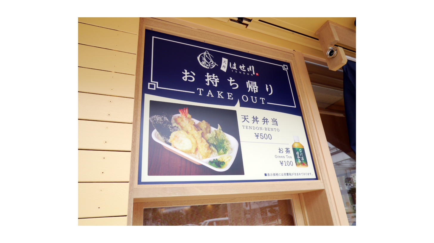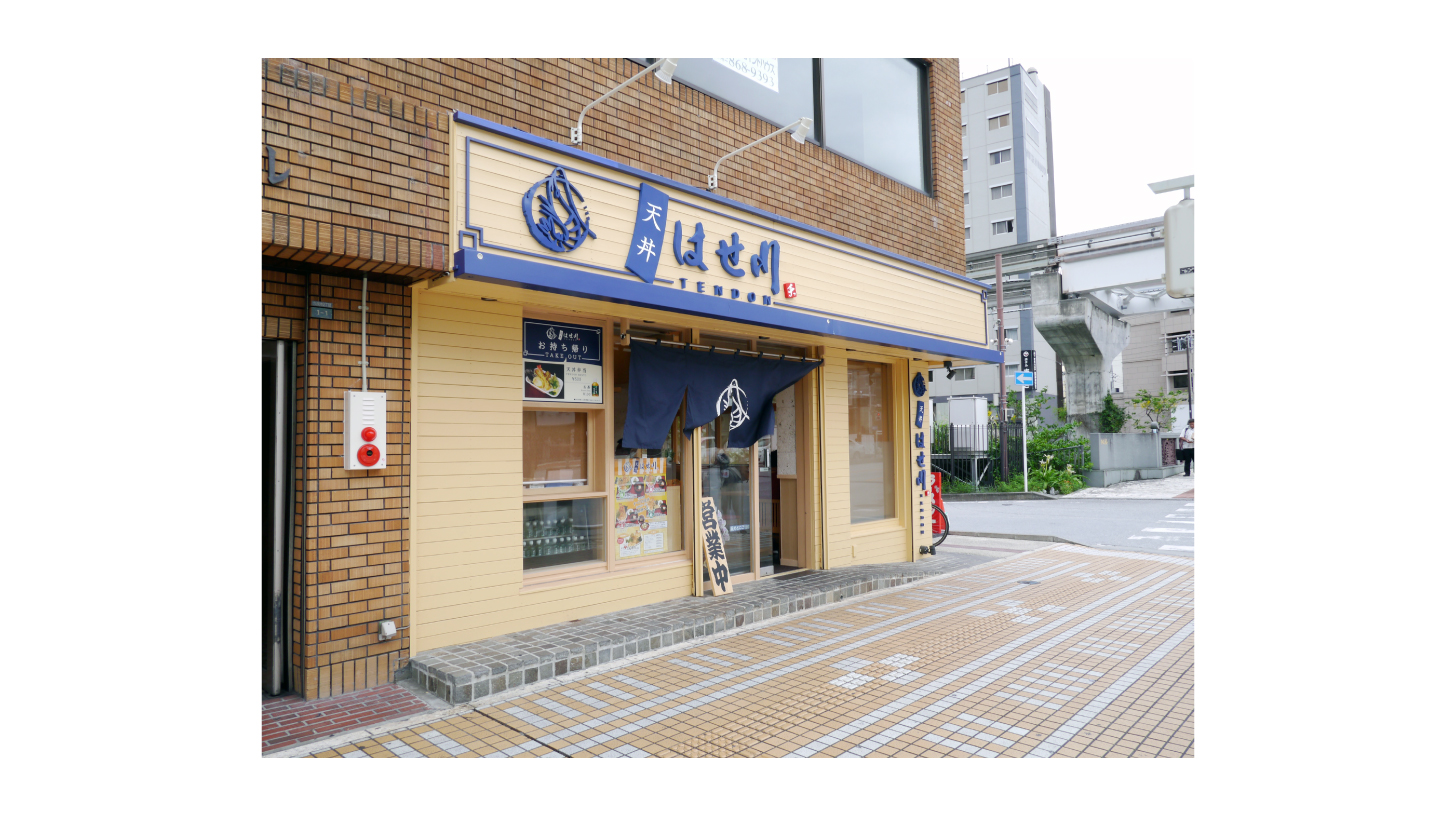 那覇市久茂地の天丼はせ川様より、店舗ロゴ・看板・外装デザインを承りました。沖縄では珍しい天丼の専門店とのことで、和を強調するためキーカラーには藍色を使い、行書体や筆書体で気品のあるテイストに仕上げました。