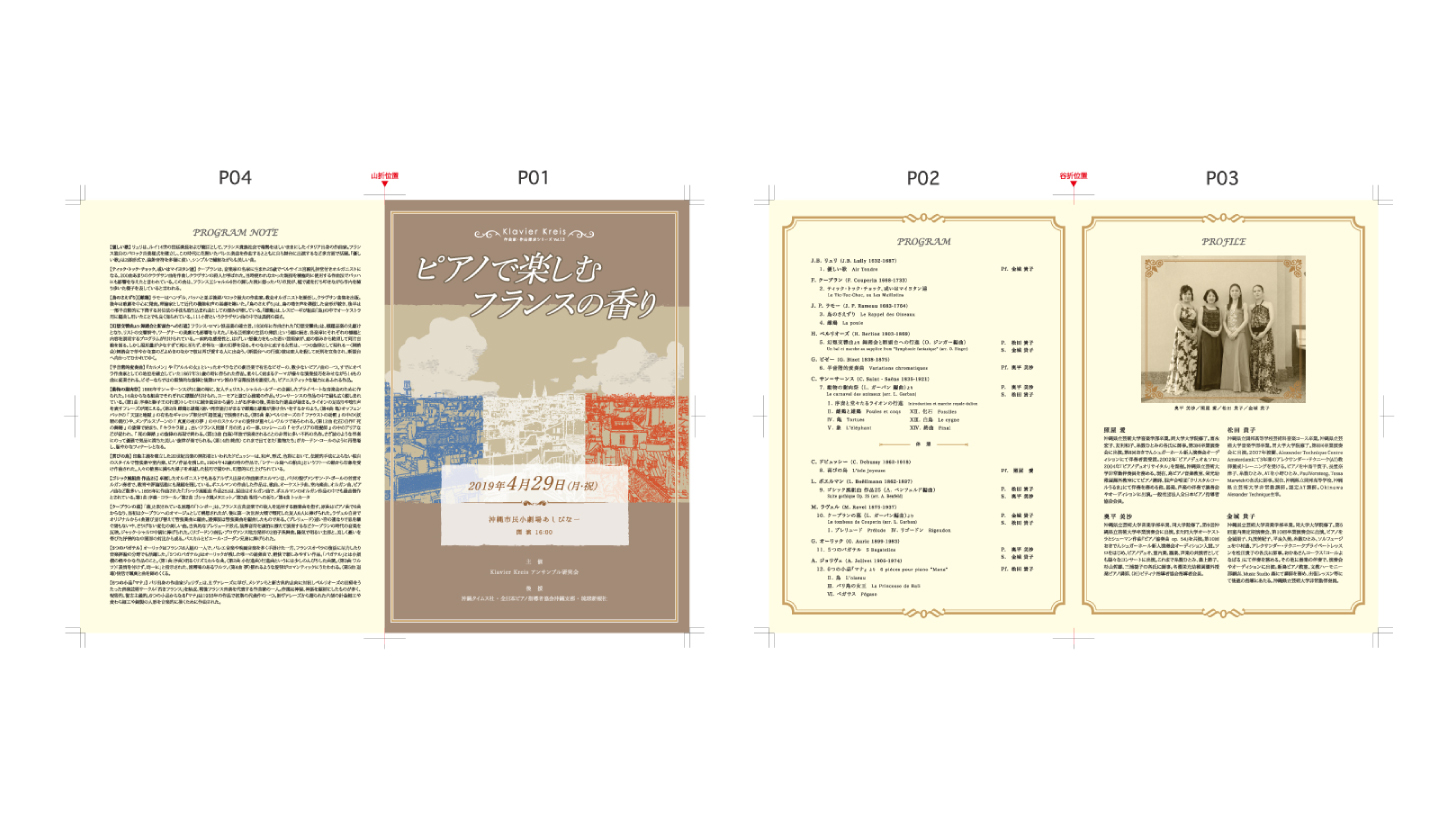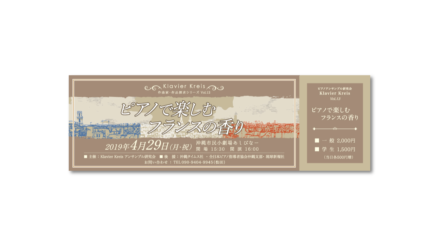 沖縄県立芸術大学音楽学部出身のピアニスト数名で構成されているユニットKlevierKreis(クラヴィーアクライス)様より、毎年ご依頼いただいておりますの演奏会のフライヤー、チケット、プログラム製作(デザイン/印刷)です。今回のテーマはフランスということで、カフェ・オ・レっぽい色合いと遠くにエッフェル塔を望むごちゃっとした街並みをイラスト化して配置しました。