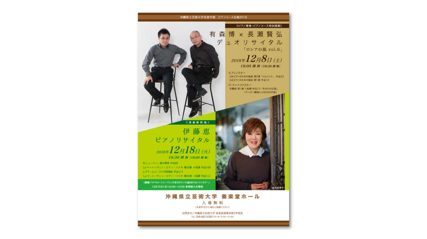 沖縄県立芸術大学音楽学部ピアノコース様より、ピアノリサイタルのフライヤー製作(デザイン/印刷)を承りました。2公演の情報を一枚に収めるということで、色味やフォントでそれぞれの公演のイメージを表現しました。