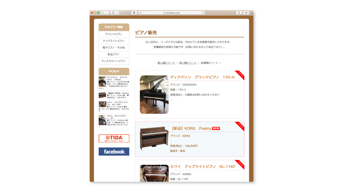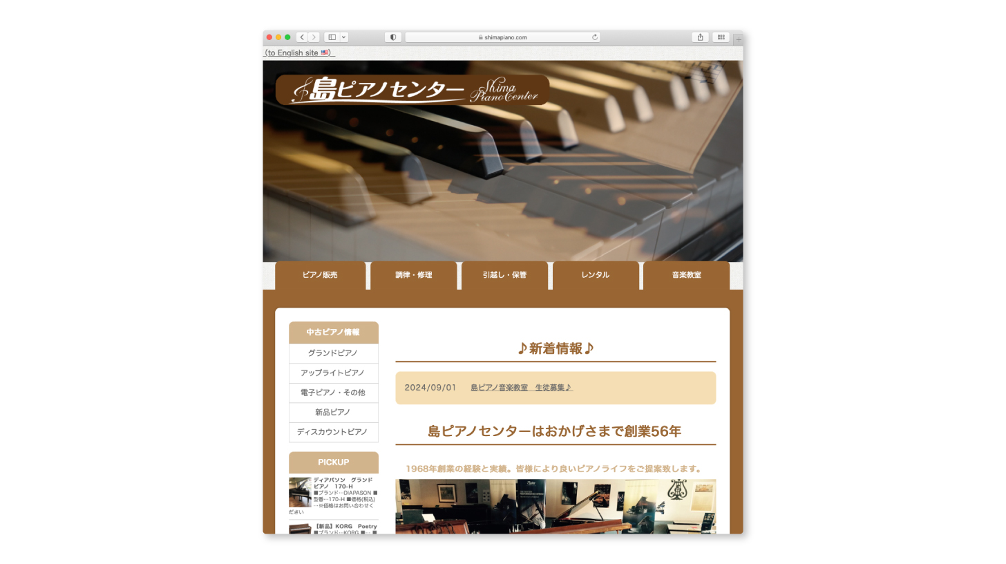 株式会社島ピアノセンター ウェブサイト:受注内容/ウェブサイト全体のデザイン制作・在庫状況管理のCMS組み込み