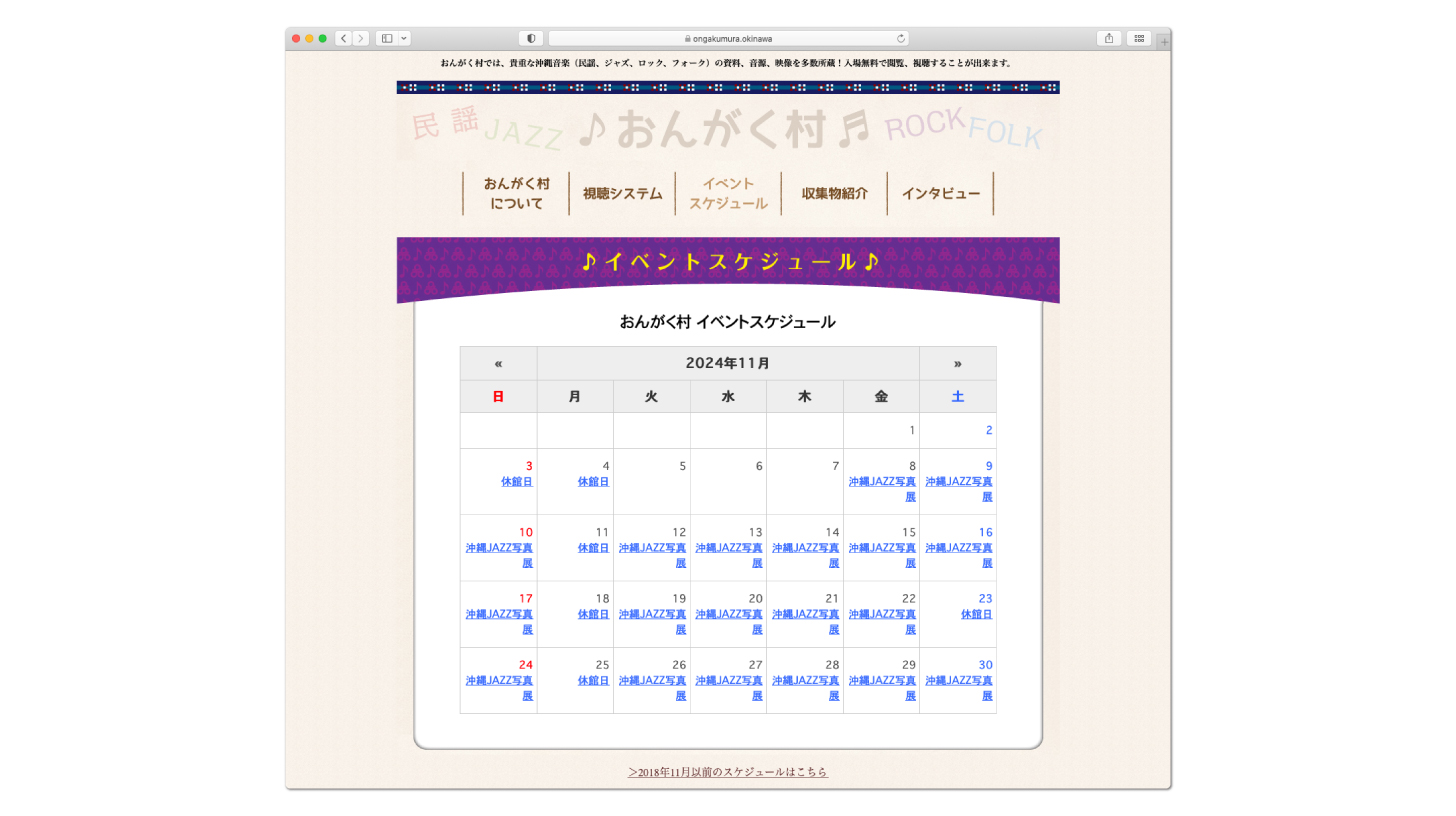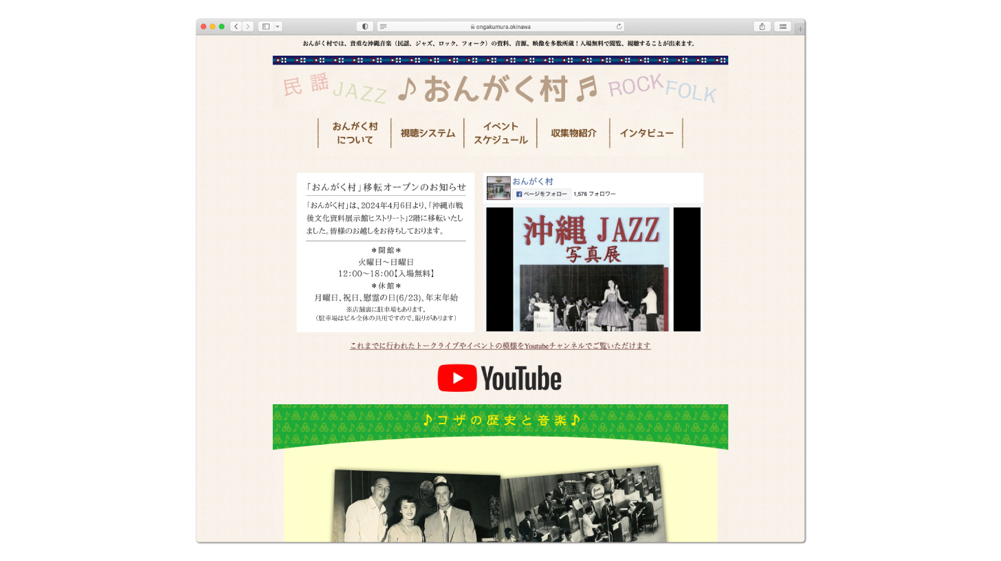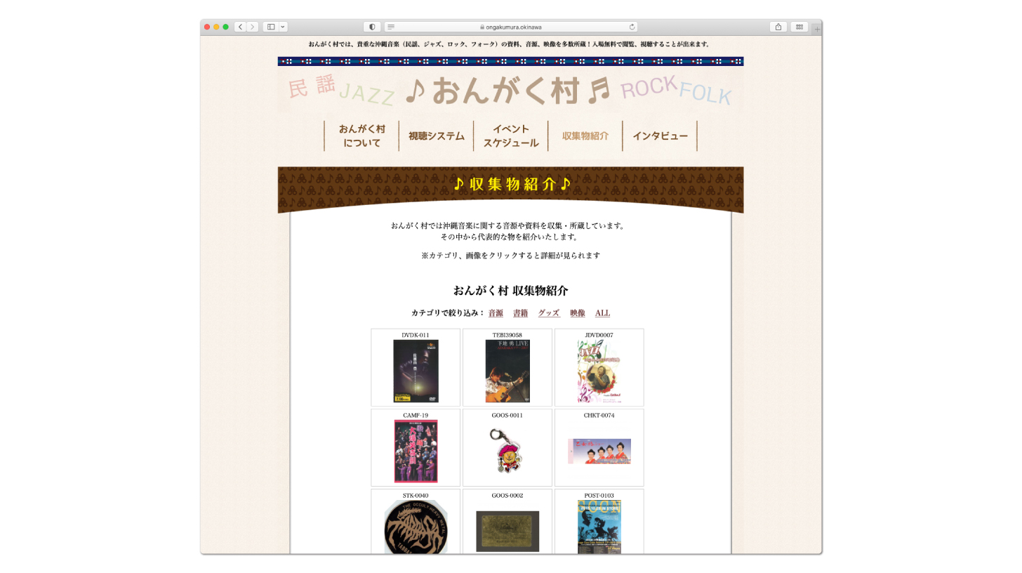 沖縄の音楽に関する資料を所蔵管理されている、おんがく村(沖縄市)のウェブサイト制作を承りました。フォークやロック、ニューミュージックから古典や民謡などトラディショナルな音楽の資料やグッズも取り扱われているということで、デザインには沖縄の織物の柄を取り入れ、タイトルバナーを柔らかな書体で作成し、ウェブサイト全体が温かみのある印象になるよう心がけました。トップページには最新情報や更新履歴が確認出来るようFacebookへのRSS連携を行いました。また、おんがく村では定期的に展示イベントを行われるということで、カレンダータイプのPHPを設置し、別ページには所蔵物の情報が確認出来るPHPを設置しました(プログラムの配布・カスタムはPHP工房様)。